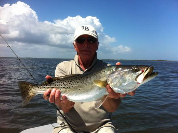 John with a nice sea trout caught in the Mosquito Lagoon with 25mph winds.